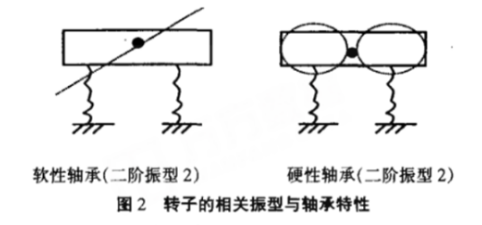 汽輪發(fā)電機轉子特別長且直徑相對較小,發(fā)電機轉子與汽輪機轉子聯(lián)結后,構成彈性 -慣性扭轉振動系統(tǒng)。而發(fā)電機與鍋爐、汽輪機、電網相互關聯(lián),因此會產生強迫扭振,這種振動可能是電氣原因造成的,也可能是機械系統(tǒng)造成的。例如:并聯(lián)運行的發(fā)電機,當機組與系統(tǒng)(電網)并列時,頻率不等會出現(xiàn)拍振電壓,產生拍振電流,其有功分量對發(fā)電機而言時正時負,制動轉矩和驅動轉矩交替出現(xiàn),作用在轉子上使發(fā)電機產生振動。電動機轉子一般和機械負載連接,當機械負載的轉軸中心與電機轉子中心不正(即偏心)時,會產生單邊磁拉力造成電動機轉子受力不均而發(fā)生振動。3B 小機 B 油泵電動機就是由于泵體中心與電動機轉子中心不正造成振動大而損壞軸承。另外,電機轉子振型也與支撐它的軸承特性有關(大多數(shù)電機的軸承可看成是硬性軸承),如圖1所示圖中軸承為硬性軸承與軟性軸承兩種情況下的一階振型。當轉子受到的交變高次諧波頻率接近于轉子固有的高頻振蕩頻率時會發(fā)生如圖 2舉例的二階及以上的高階振型。